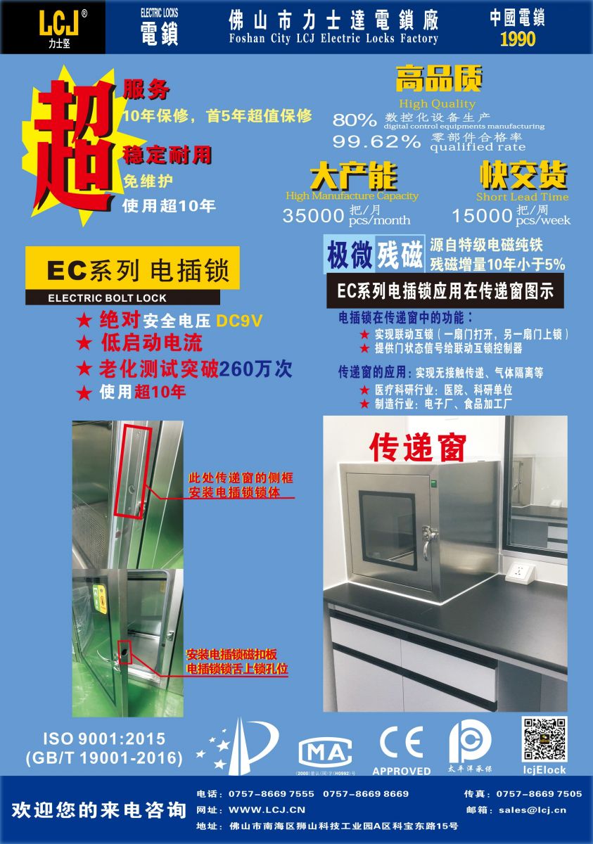 EC系列电插锁,应用于传递窗及医疗、净化行业,与您共同抗疫!260万次老化测试,超稳定耐用!
