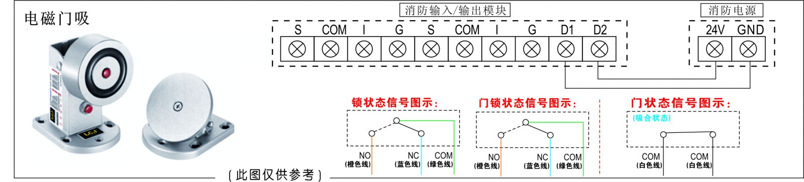 电磁门吸配套消防联运控制系统、消防输入/输出模块、防火门监视器,广泛应用于各类智能大厦、综合大楼的防火门、防烟门、消防门,橱窗门等。