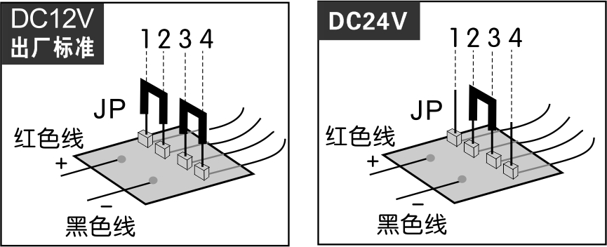 4、电磁门吸出厂时的标准:工作电压为DC12V 。如需使用在DC24V的系统中,请用跳线帽连接JP的第2脚与第3脚(如下图调节方法)。