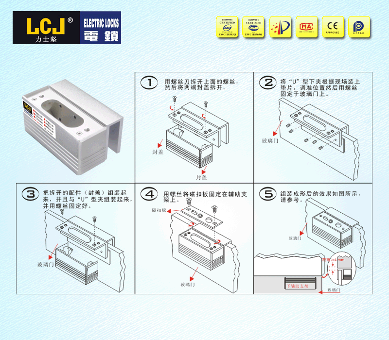 配合电插锁EC235系列、EC235H磁扣板,应用于8~12mm厚无框玻璃门(15mm玻璃特定) |