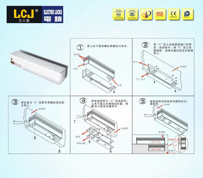 配合电插锁EC235系列、EC235H锁体,应用于8~12mm厚上无框玻璃门(15mm玻璃特定) |